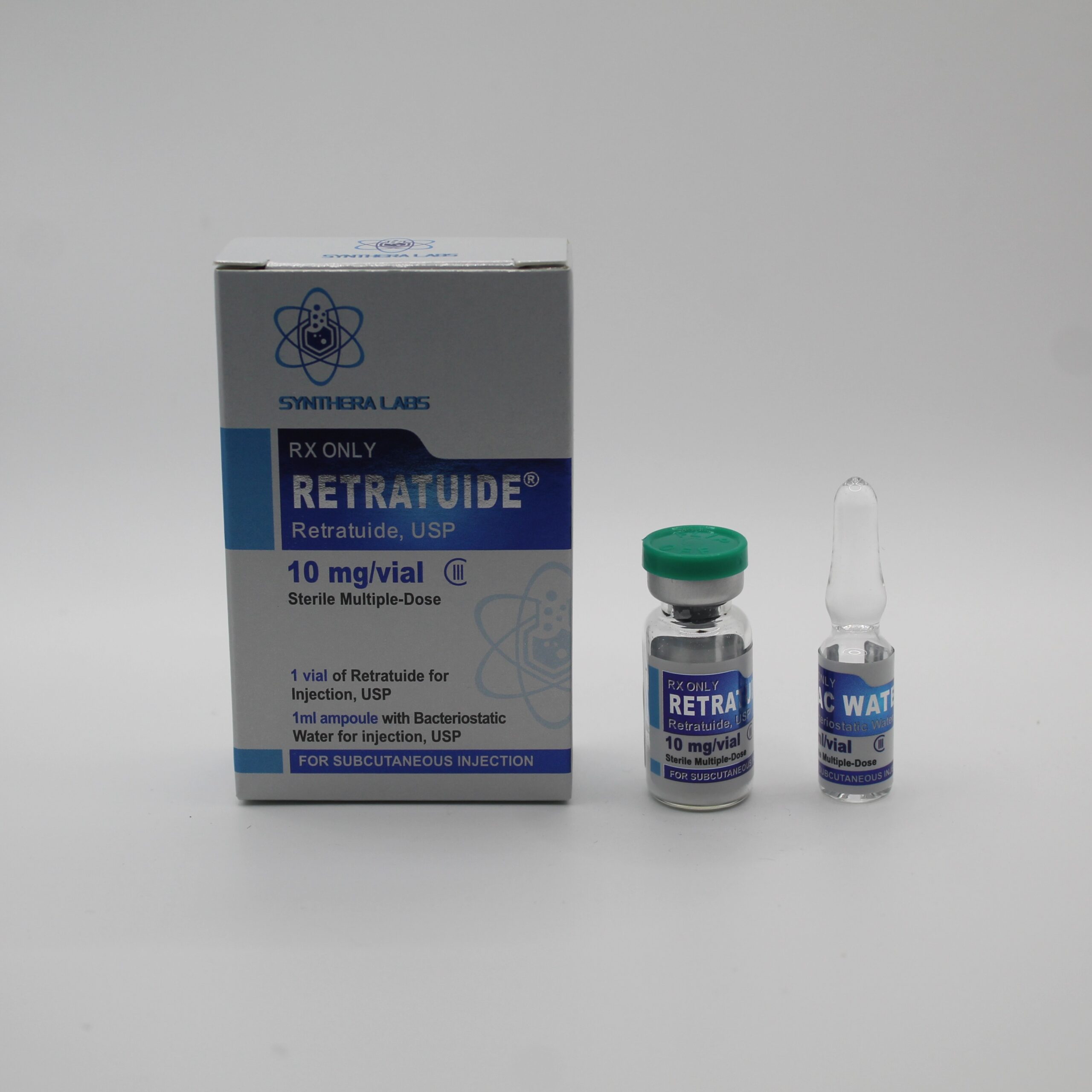 A retatrutida é apresentada em frasco para injetáveis contendo 10 mg de pó liofilizado. Deve ser reconstituído com a água bacteriostática fornecida antes do uso. V