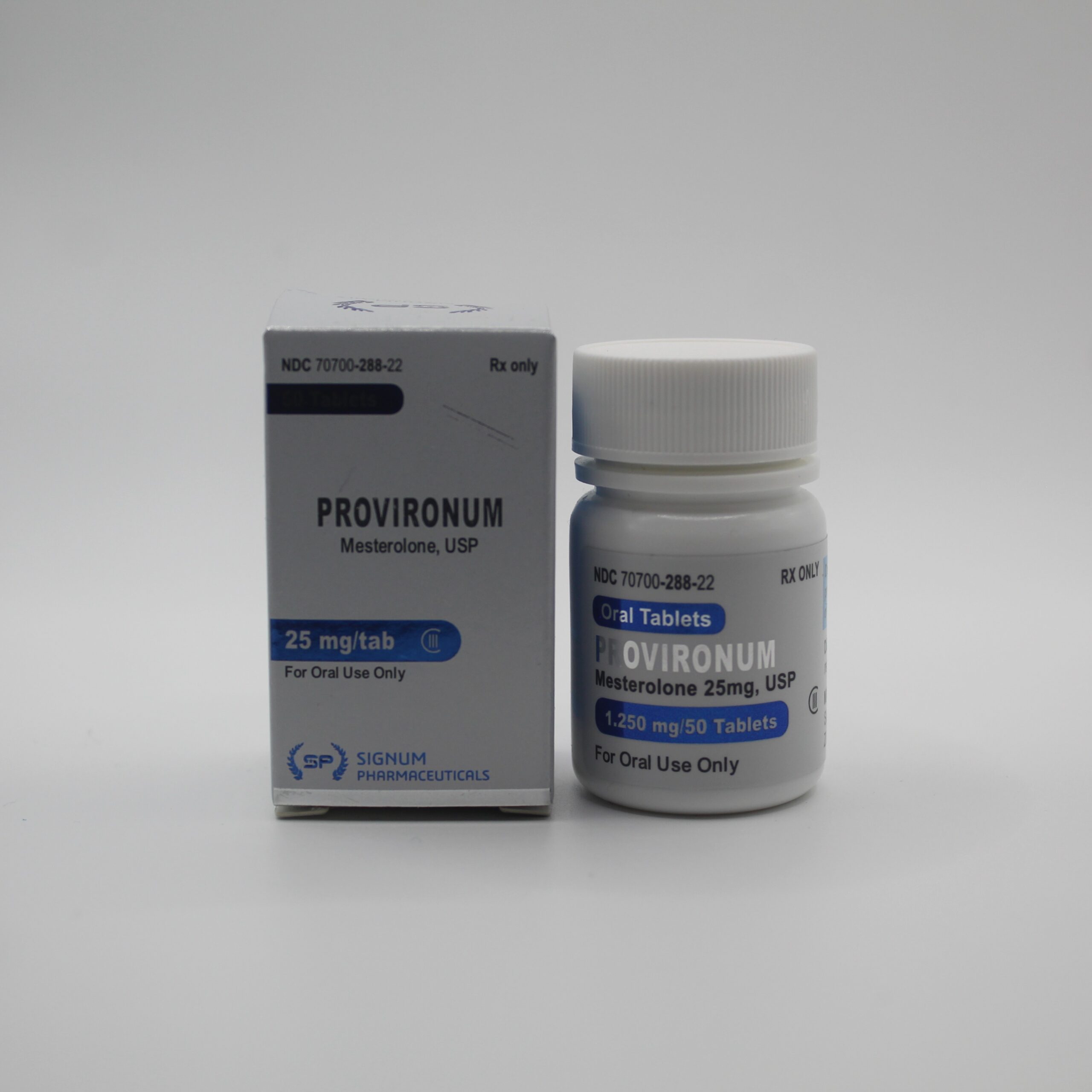 - Apresentação: 50 comprimidos, cada um contendo 25 mg de Mesterolona.