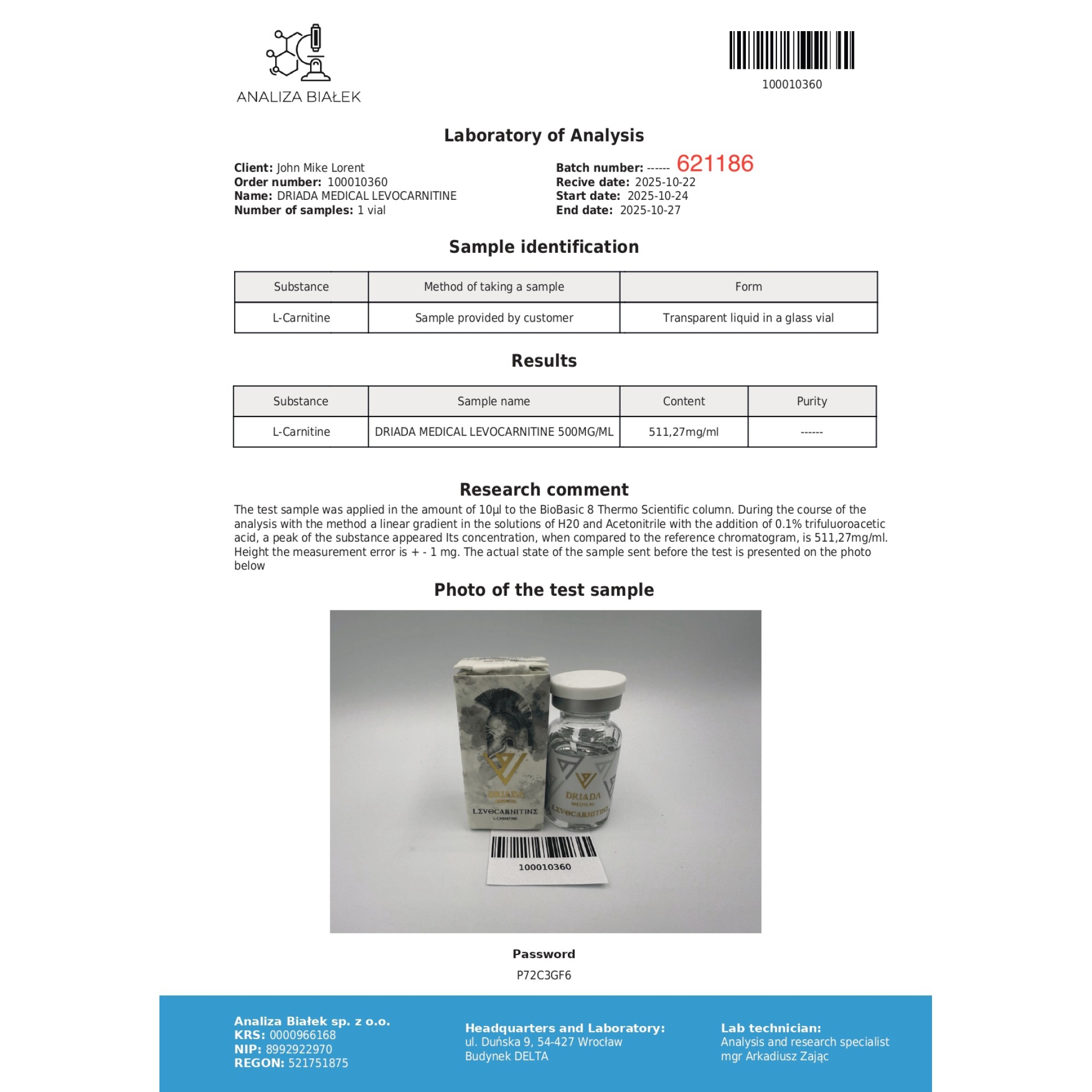 L-Carnitine 500mg/ml Driada Medical
